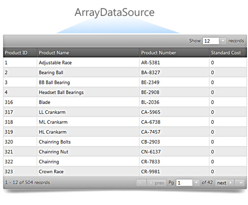 The Infragistics Data Source client-side component is implemented as a class, and has support for paging, sorting, and filtering