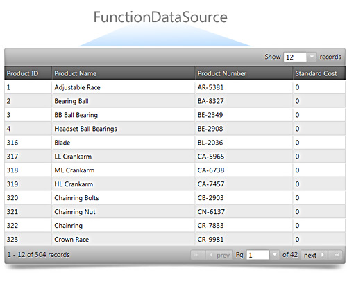 var myFunction = function() { var products = []; products[0] = { "Name": "Bearing Ball", "Price": 45.44, "Rating": 4 }; products[1] = { "Name": "Bearing Ball 1", "Price": 17.27, "Rating": 3 }; products[2] = { "Name": "Bearing Ball 2", "Price": 13.44, "Rating": 7 }; products[3] = { "Name": "Bearing Ball 3", "Price": 18.25, "Rating": 4 }; products[4] = { "Name": "Bearing Ball 4", "Price": 12.17, "Rating": 3 }; return products; } var ds; $(window).load(function () { ds = new $.ig.FunctionDataSource({ dataSource: myFunction, schema: { fields: [{ name: "Name" }, { name: "Price" }, { name: "Rating" }] }, paging: { enabled: true, pageSize: 3, type: "local" } }); ds.dataBind(); });-