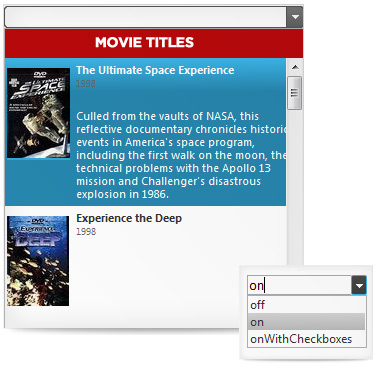 The igCombo control is a jQuery combo box which supports virtualization, auto-complete, auto-suggest, multiple selection, and item templates. With the igCombo control you can create drop downs that accept text entries as well as options selected from the items list. Further information regarding the classes, options, events, methods and themes of this API are available under the associated tabs above.