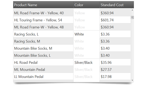 Merged cell feature of the igGrid allows you to combine cells in a column that are next to each other and have the same values. This is very useful after a column is sorted, because the cells that have the same values are merged.