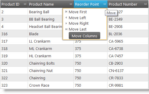 Both the igGrid and igHierarchicalGrid controls feature column moving in the grid. Column moving allows you to change the order of the columns as they appear in the grid. The column moving features has two modes: