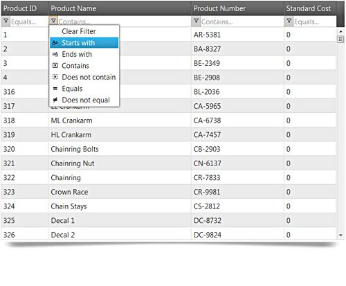 Both the igGrid and igHierarchicalGrid controls feature row filtering which allows users to restrict grid rows to only the data that meets a given criteria. Filtering options include numeric, string and date filters. Further information regarding the classes, options, events, methods and themes of this API are available under the associated tabs above.