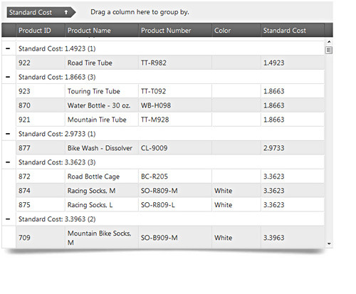 //Initialize $(".selector").igGrid({ features: [ { name: "GroupBy", columnSettings: [ // The code in this example specifies that data must be grouped by // the Color column and the average, the minimum and the maximum of // the ListPrice column must be calculated and displayed for each group. { columnKey: "Color", isGroupBy: true }, { columnKey: "ListPrice", allowGrouping: false, summaries: [ { summaryFunction: "avg", text: " average:" }, { summaryFunction: "min", text: " minimal:" }, { summaryFunction: "max", text: " maximal:" } ] } ] } ] });-