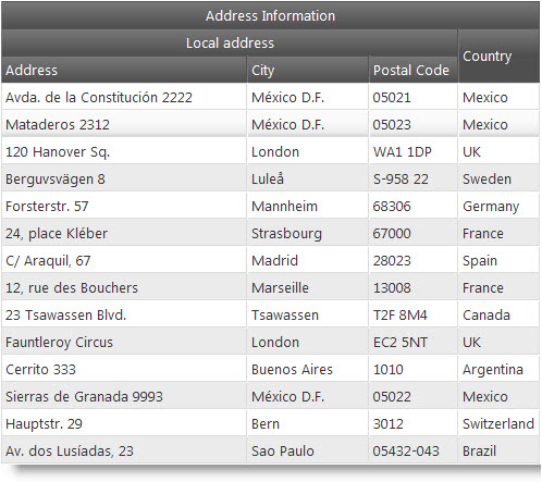 Both the igGrid and igHierarchicalGrid controls feature multi-column headers. The multi-column headers feature provides header grouping and is well integrated with the Hiding, Resizing and ColumnMoving features. Further information regarding the classes, options, events, methods and themes of this API are available under the associated tabs above.