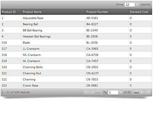 Both the igGrid and igHierarchicalGrid controls feature paging in the grid. Paging allows the grid to render a limited number of rows of the underlying set of data to the user at a time. Depending on how the grid is configured, you can choose to send all or just a sub-set of data to the client at a time. Further information regarding the classes, options, events, methods and themes of this API are available under the associated tabs above.