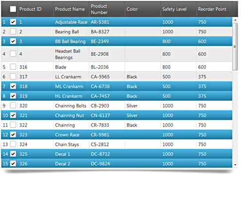 Both the igGrid and igHierarchicalGrid controls feature row selection in the grid. Using row selectors you can configure the control to select single or multiple rows in the grid. You may also optionally enable row numbering with row selection. Further information regarding the classes, options, events, methods and themes of this API are available under the associated tabs above.