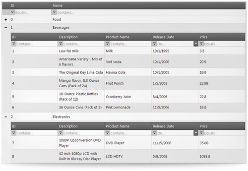 The igHierarchicalGrid control is a hierarchical jQuery Grid control that features filtering, group by, column hiding, paging, column resizing, row selectors, cell selection, sorting, column summaries, tooltips, and updating functionality. For more information on each of these features, see their corresponding API document: igGridFiltering, igGridGroupBy, igGridHiding, igGridResizing, igGridPaging, igGridRowSelectors, igGridSelection, igGridSorting, igGridSummaries, igGridTooltips, igGridUpating. The igHierarchicalGrid control is built on top of the stand-alone flat-data igGrid control. The API for the igGrid control serves as the base for configuring the igHierarchicalGrid control and its columnLayouts settings. See the igGrid control API document for more details.
