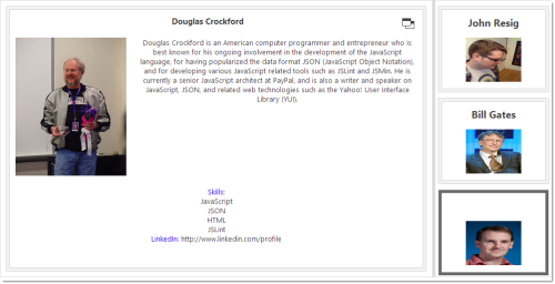 text: 'Douglas Crockford is an American computer programmer and entrepreneur who is best known for his ongoing involvement in the development of the JavaScript language, for having popularized the data format JSON (JavaScript Object Notation), and for developing various JavaScript related tools such as JSLint and JSMin. He is currently a senior JavaScript architect at PayPal, and is also a writer and speaker on JavaScript, JSON, and related web technologies such as the Yahoo! User Interface Library (YUI).',