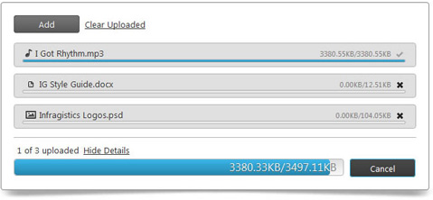 The igUpload control is a jQuery file upload control for ASP.NET and ASP.NET MVC. The control supports multiple file uploads, progress notification, and cancellation. In addition to the client-side jQuery API, refer to the server-side API for information about server-side functionality. Further information regarding the classes, options, events, methods and themes of this API are available under the associated tabs above.