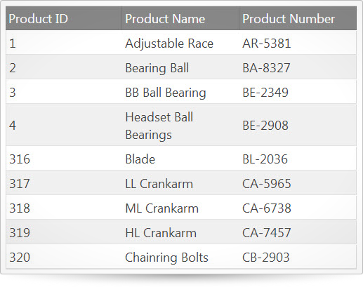 { "ProductID": 1, "Name": "Adjustable Race", "ProductNumber": "AR-5381" },