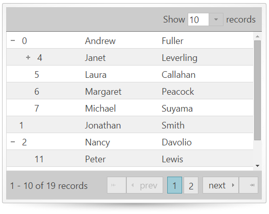 The igTreeGrid includes paging which allows the grid to render a limited number of rows of the underlying set of data to the user at a time. Depending on how the grid is configured, you can choose to send all or just a sub-set of data to the client at a time and you can control whether to page all records or the just root level rows. Further information regarding the classes, options, events, methods and themes of this API are available under the associated tabs above.