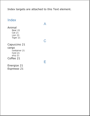 The following code creates a Text element and adds several targets in order to populate the index. An index is then created with two levels.