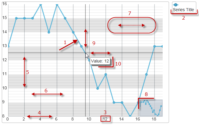 The following picture demonstrates the configurable visual elements of the igDataChart control. A listing of the properties that manage them is available in the Configurable visual elements and related properties block below.