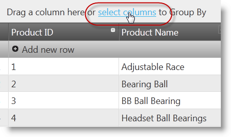 To display the Group By dialog, click the select column link in the igGrid Group By area, which by default is at the top of the grid.