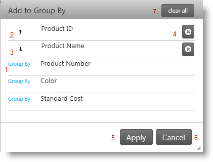 The window has two grouping behaviors – immediate grouping and deferred grouping (default) which define whether the grid updates automatically when the user performs a grouping action. These behaviors are managed by the state of the modalDialogGroupByOnClick property. See the configurable behaviors chart for further details.