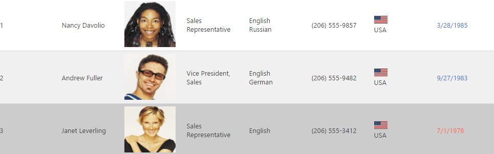 The following screenshot previews of the result. In this example the rows the cells with Birth Date before 1950 use a blue colored font; otherwise, the font color is red. The country cell is templated with an image.