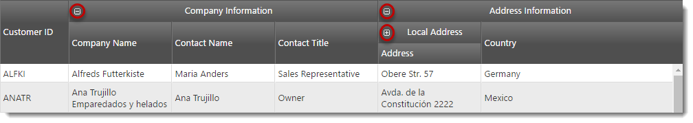 The following steps demonstrate how to configure multi-column headers with collapsible column groups in igGrid.