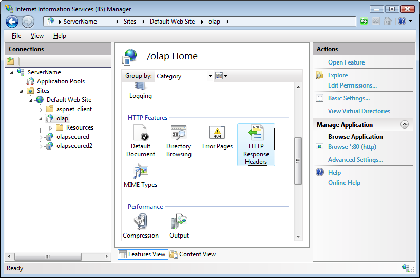 Using the IIS Manager interface, navigate to your application that is hosting the HTTP access provider (msmdpump.dll). In this case, you will be accessing the OLAP application.