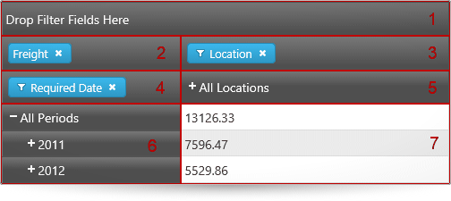 By dragging-and-dropping hierarchies from one drop-area to the other drop-areas, users can change the currently used hierarchies and measures, thus changing the tabular view of the result set displayed in the header areas and the cells. The row and column header areas display the members of the respective hierarchies and allow for expanding and collapsing of members (that have child member nodes). In each cell, the meaning of the value displayed is an intersection of the meanings of the respective column and row members (e.g. in the picture above, the meaning of the value 7596.47 is created by the intersection of “all locations” (= name of the column member) and “2011” (= name of the row member), i.e. the meaning is “what the freight for all products for the 2011 in all locations amounts to”).