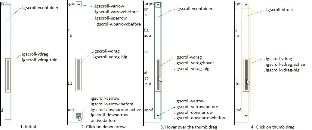 igscroll-vcontainerigscroll-vtrackigscroll-varrowigscroll-uparrowigscroll-uparrow-activeigscroll-downarrowigscroll-downarrow-activeigscroll-vdragigscroll-vdrag-thinigscroll-vdrag-bigTo visualize which CSS class for which element is being used refer to the following picture. It displays four different scenarios that the default custom scrollbar has and shows each class applied: