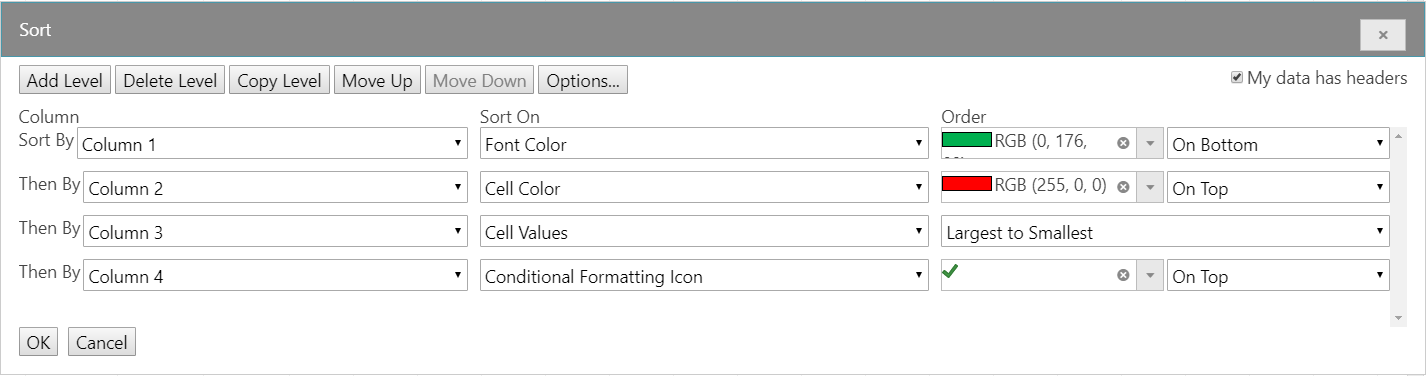 The igSpreadsheet control provides a custom sort dialog, aimed at sorting multiple columns in a defined order.