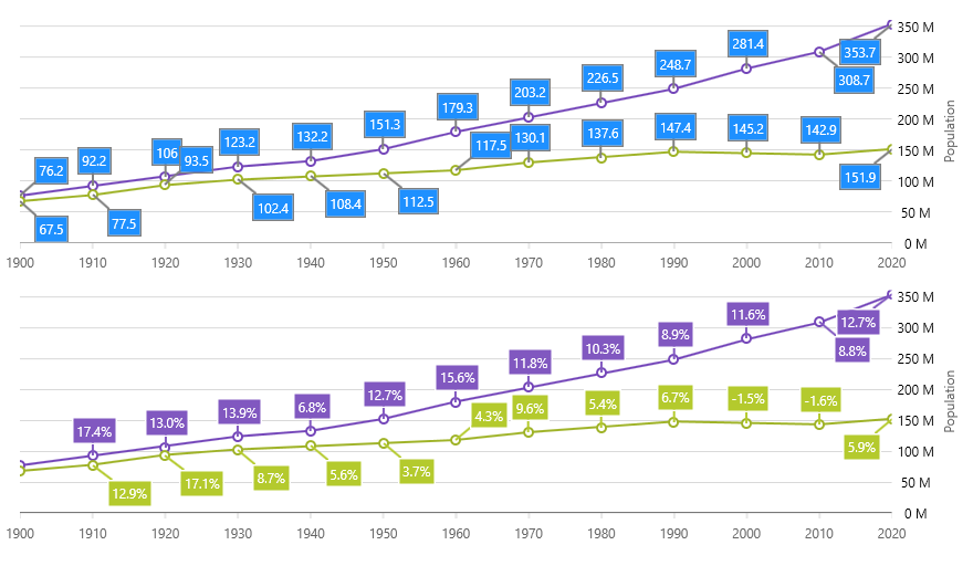 Callouts Layer is a new feature of Data Chart that you can use to annotate important data points or display their values. Callouts Layer can target multiple data series or individual data series. Also, you can customize appearance of these callout layers and bind callout labels to data items or calculate changes between consecutive data points.