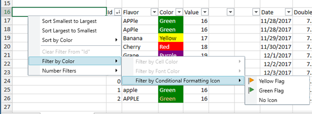 In 18.1, we added the AutoFilter dropdown to the spreadsheet. The dropdown had menu items for sorting ascending/descending, clearing a filter applied to the column and to apply a numeric/date/text filter. However, it didn’t have a way to apply a sort or filter based on the forecolor, fill or icon. In 18.2, that dropdown contains items to allow filtering or sorting based on the foreground, fill or icon of the cells within that column.