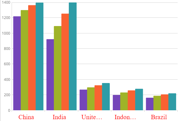The look and feel of the category chart's x-axis and y-axis labels can be styled in many aspects, the main of which are applying different font styles such as font type, font size and text color. This can be achieved through the following properties:
