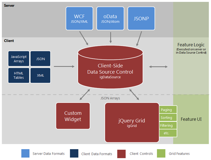 Figure 1 depicts the grid architecture from a high level. The client-side data source control, or igDataSource™, is at the heart of the grid’s core functionality. As data comes into the data source, either from the client or the server, the data source control is responsible for processing and preparing the data to expose to the grid for final rendering. When optional features are added to the grid, their logical counterparts are automatically added to the data source control for execution. Feature logic may execute on the client or on the sever depending on how you configure the data source control.