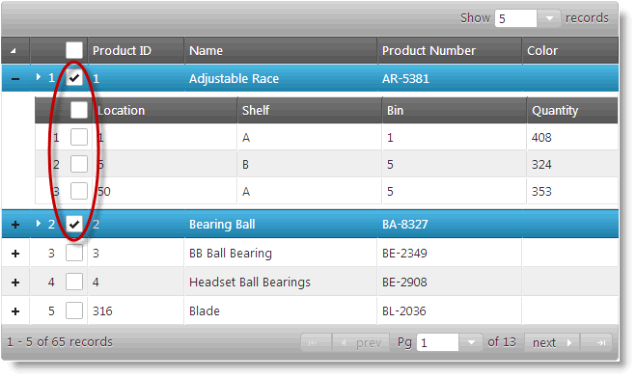The picture below shows a hierarchical grid with row selectors checkboxes enabled. The red ellipse emphasis the checkboxes on the first two master rows.