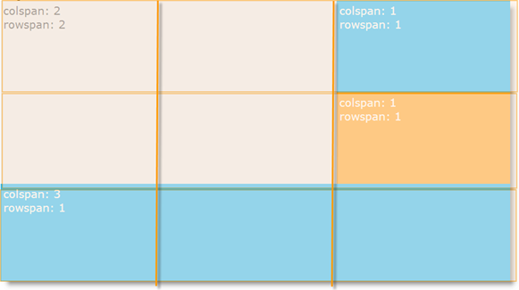 Rows and columns can be spanned for accommodating items of different sizes. Note that items can only have sizes that are multiples of the grid cell size in the respective dimension (width or height). The following picture presents schematically 4 items of different sizes arranged in a 3x3 grid. The topmost-left cell spans over the adjacent cells one column to the right and one row downwards. On the third row, the utmost-left cell spans to the right over all across all 3 columns.