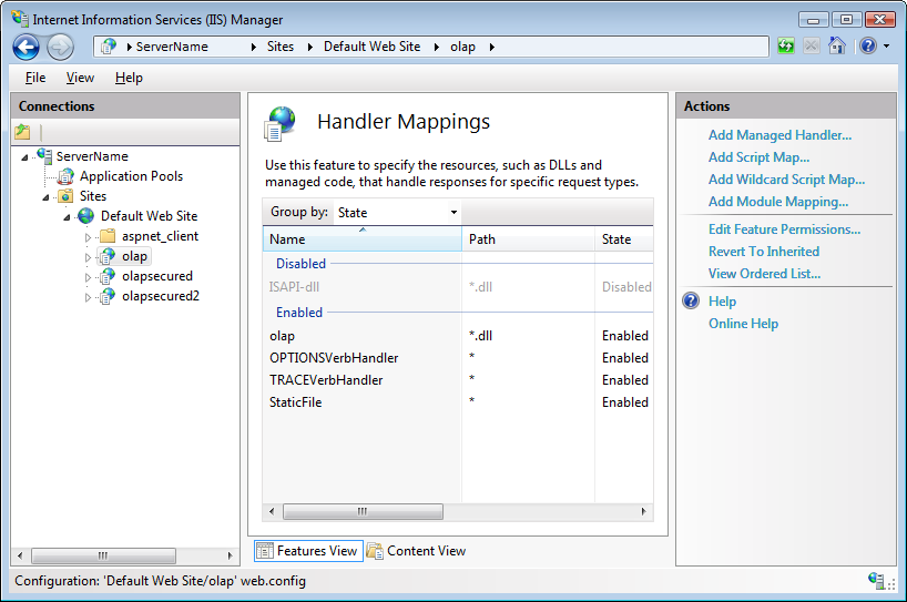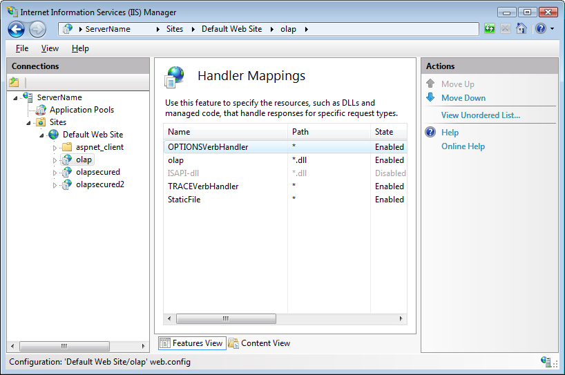 Using the IIS Manager interface, navigate to your application that is hosting the HTTP access provider (msmdpump.dll). In this case, you will be accessing the OLAP application.