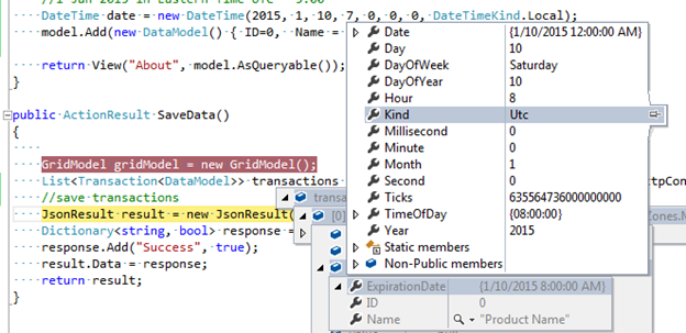 In that case the hour is 10 AM, and because the time zone is GMT+01:00, then the MVC wrapper will transform that value to UTC, in the following format: 2016-01-09T09:35:55.0000000Z. In addition it will add displayTimeOffset of 60 minutes. This is what will be rendered by the wrapper in the response: