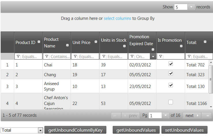 • Unbound columns: The unbound column provides a way to define a column in the igGrid and igHierarchicalGrid which is not bound to a data source and can be used for rendering calculated or otherwise custom values