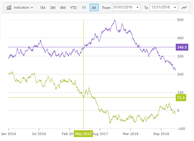The Financial Chart now comes built-in with a new legend displayed between the toolbar and plotting area. This legend show titles of the data sources and it also shows the last value and percentage change between first data item and the last data item.