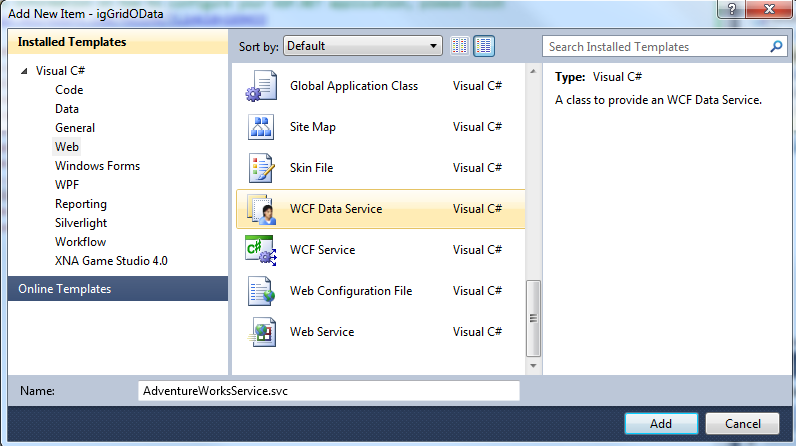 Next add a WCF Data Service to the project named ‘AdventureWorksService.svc’: