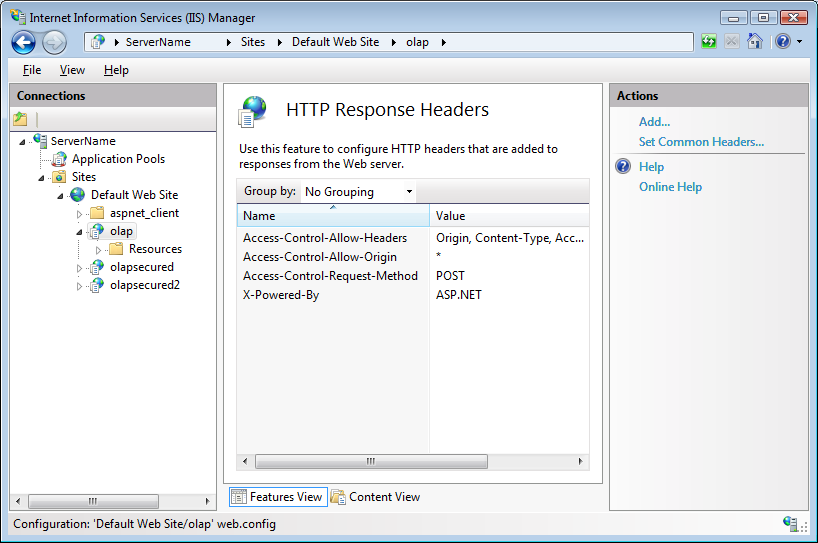 This topic explains how to configure Internet Information Services (IIS) hosting HTTP data provider (msmdpump.dll) for SQL Server Analysis Services (SSAS), for cross-domain access (both authenticated and non-authenticated access). These settings are required for certain usage scenarios of the igOlapXmlaDataSource control.