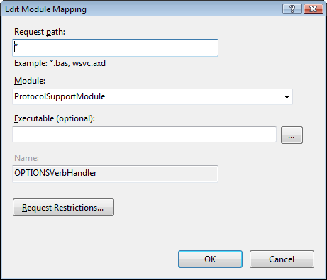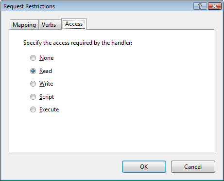 | OPTIONSVerbHandler | Read | Specifies that the handler requires read access to the requests. |