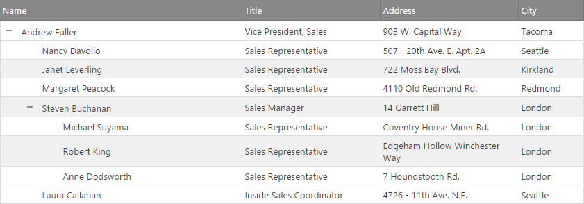 @(Html.Infragistics().TreeGrid<IgniteUI.SamplesBrowser.Models.EmployeeData>()