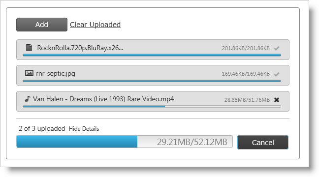 The Ignite UI for jQuery™ upload control, or igUpload, is a control that allows you to upload any types of files, sending them from the client browser to the server. The size of the uploaded files can be restricted only by server limitations, so you can upload large files with size more than default 10MB.