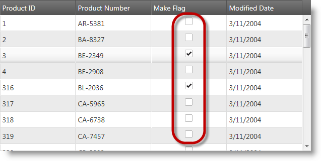 Boolean data columns can be rendered with checkboxes in flat and hierarchical grids. This provides user-friendly experience for dealing with Boolean type data. On the screenshot below you can see a grid with a Boolean column with checkbox editors.