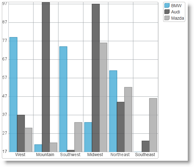 igDataChart -allows various types of data series to be represented like financial, bar/column, scatter, polar and radial.igPieChart -designed to provide pie chartsigChartLegend - used internally to produce legends for charts.On the screenshot below you can see a column chart with three data series.