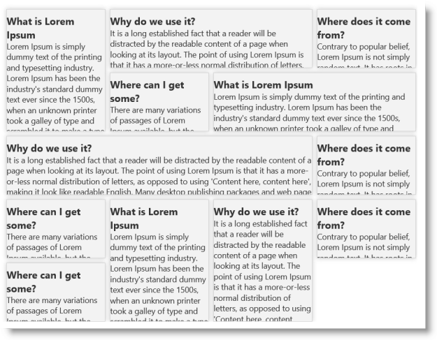 The igTileManager is a layout control for rendering and managing data into tiles. The tiles are displayed in a responsive grid layout, and the control provides corresponding layout configurations for each tile in terms to position (row and column spans) and dimensions (row and column position).