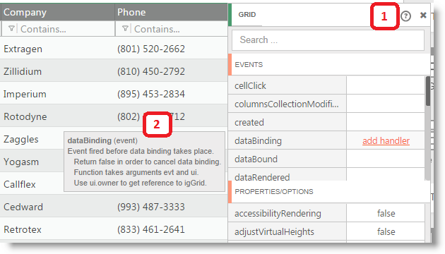 1. For Ignite UI for jQuery componets, you can click the ? link in the component editor to go directly to the API docs for that component.