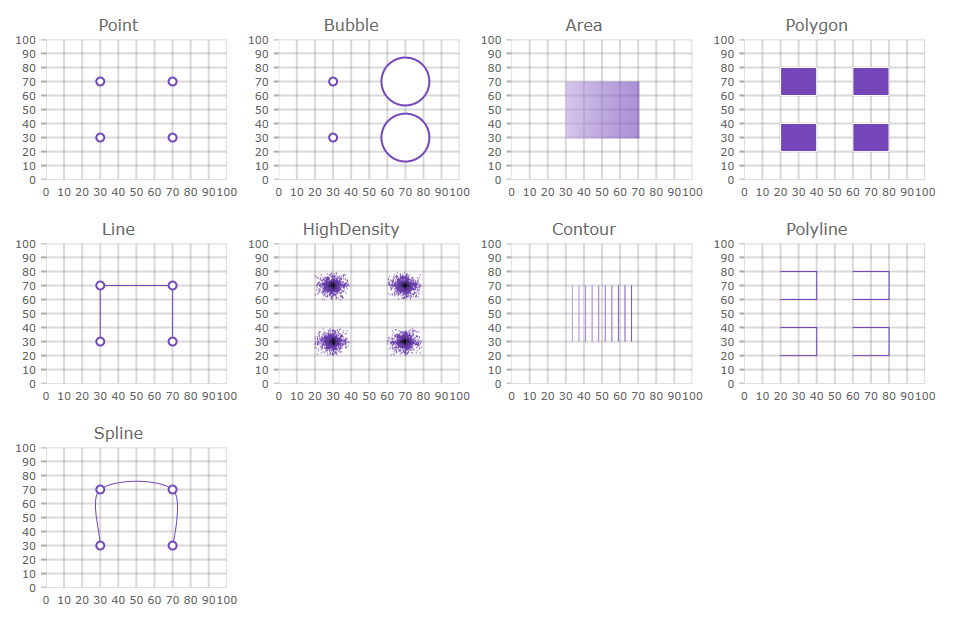 The igShapeChart is a lightweight, highly performant chart. This chart can be easily configured to display scatter X/Y points, shape files or any custom shape that you can define using an array of arrays of X/Y points. The igShapeChart control is using a smart data adapter in order to analyze bound data and select an appropriate visualization to render. However, it is possible to specify which chart type the igShapeChart will use by setting the chartType property to one of the following values: Area,Bubble,Contour,HighDensity,Point,Line, Spline, Polygon, or Polyline.