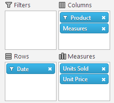 This topic explains how to configure the tabular View of the OLAP cube result set by arranging the hierarchies of the pivot grid columns, rows, filters, and measures, either from the grid’s interface or programmatically in the code.