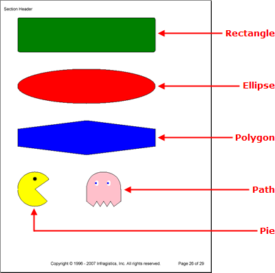 The following code adds a rectangle, ellipse, polygon, pie, and path to a Site element. This topic assumes that you have defined a Report element and have at least one Section element added to it. For more information, see Report and Section.