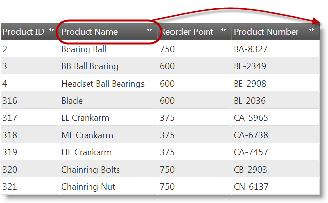 The code in this example moves the Product Number column between the Product ID and Product Name column. The actual moving is performed by Grid Re-Rendering.