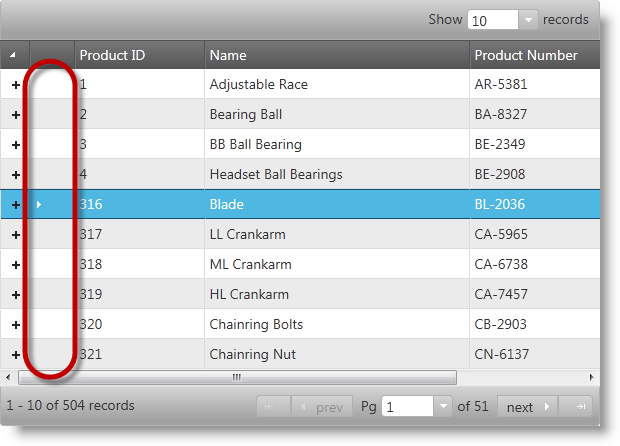 The row selection feature provides the user with the functionality to select entire rows by clicking on the row selector column placed on the left side of the first grid column. This functionality is provided by the igRowSelectors™ widget. In addition, to this main functionality, the widget provides optional row numbering and checkboxes for row selection. This widget works closely with the Selection feature but can also be used separately for its row numbering capability. There is a new option showCheckBoxesOnFocus which when enabled allows checkbox behavior to be modified: checkboxes do not appear initially and when the user clicks to select a row checkboxes show to make multiple selection easier. On the screenshot below you can see a grid with row selection column highlighted and one row selected.
