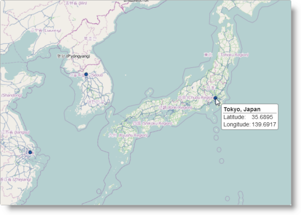 | Binding to data attributes | Map series are based on custom data in addition to geographic coordinates and/or triangles. You can access and display custom data attributes (or members of data records) in tooltips or custom markers. |